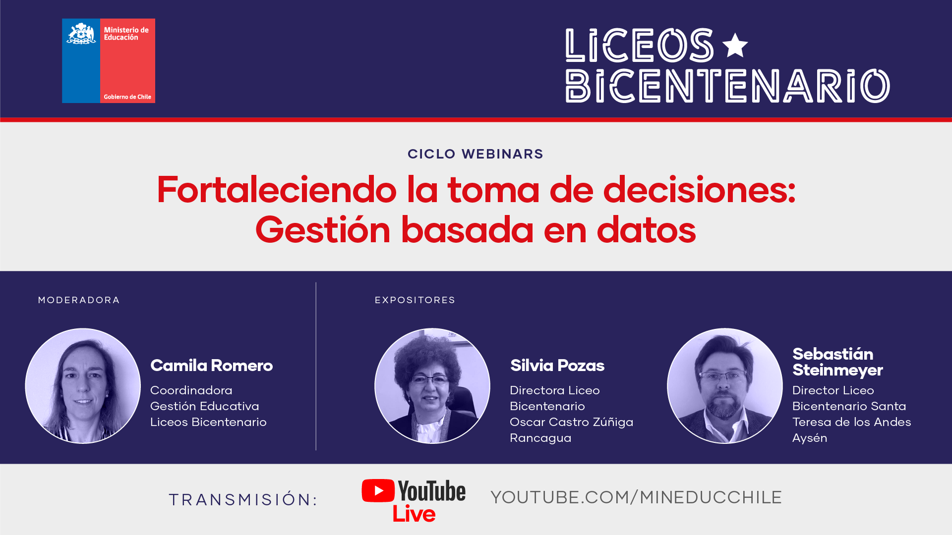 “Fortaleciendo la toma de decisiones: gestión basada en datos” fue el nuevo webinar de Liceos Bicentenario que se desarrolló el martes 21 de julio, y que reunió a equipos directivos y docentes de los 200 liceos que conforman la red, con el objetivo de mostrar el valor que tiene el monitoreo constante y el uso de datos para la toma de decisiones pedagógicas.